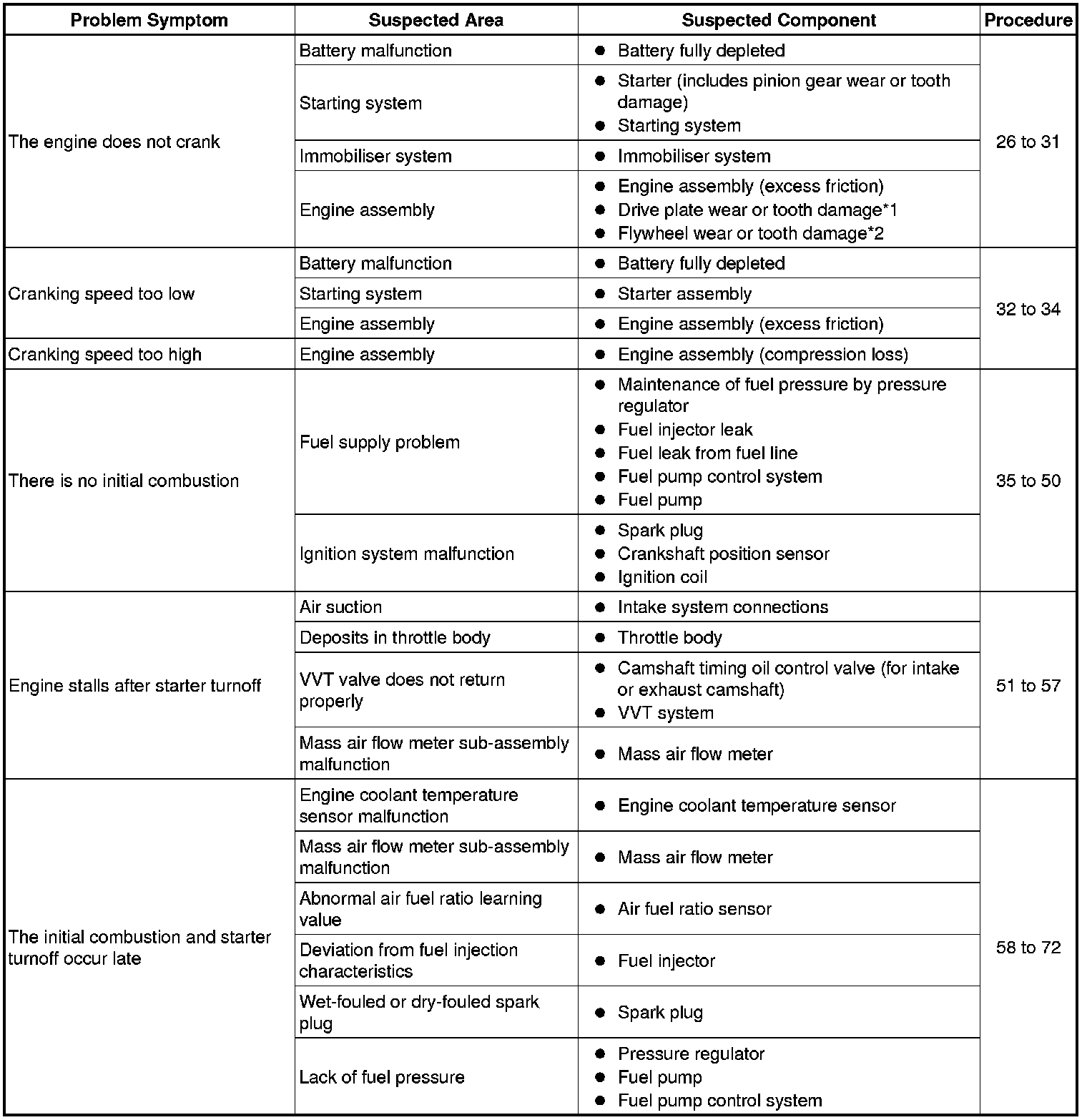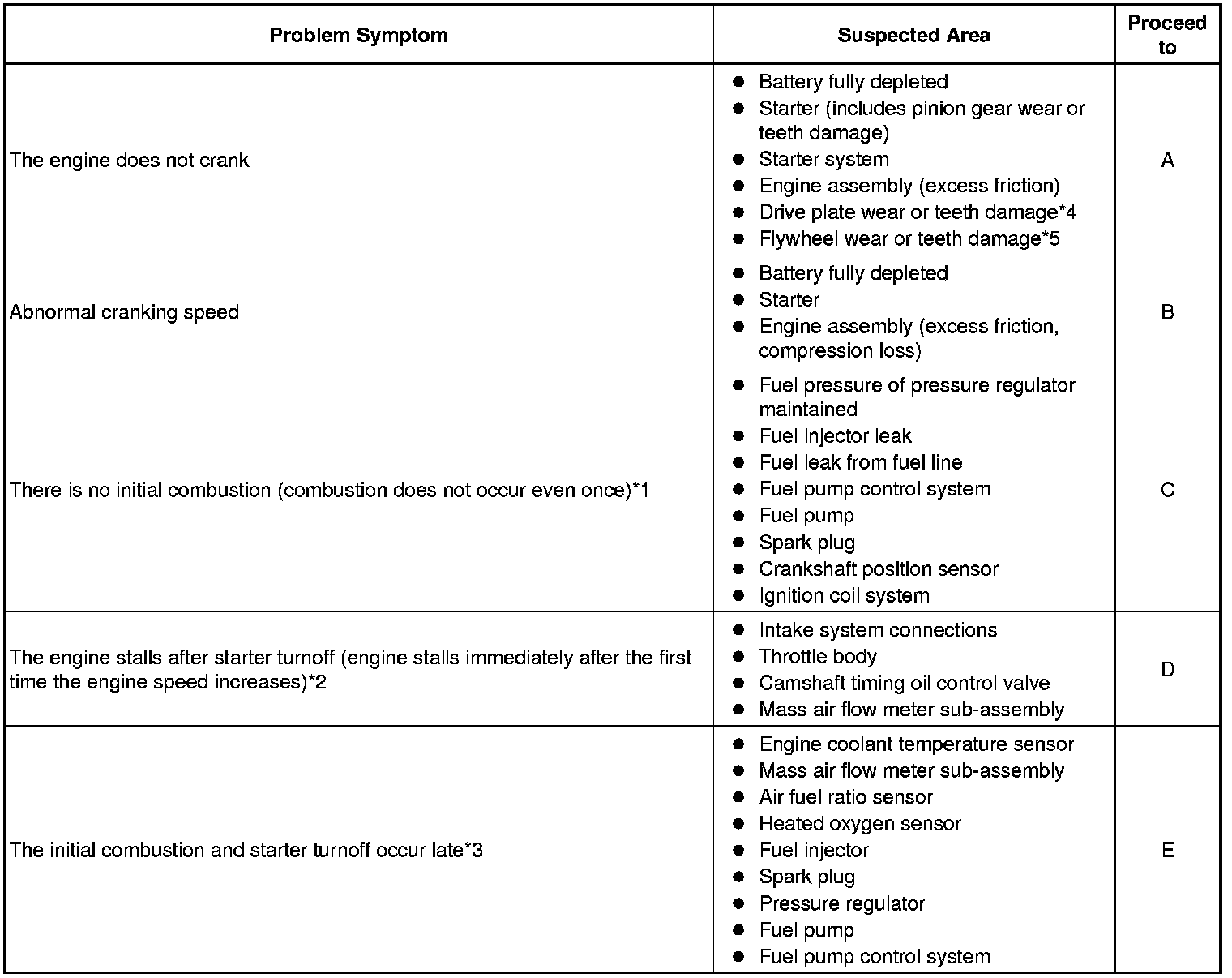 * *2: If the engine stalls after starter turnoff, the air-fuel ratio may be incorrect or the camshaft timing oil control valve may have a problem returning.