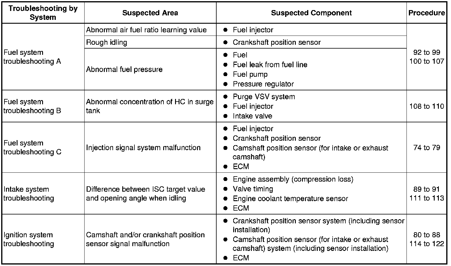 The problem symptoms below can be determined by reading the freeze frame data.