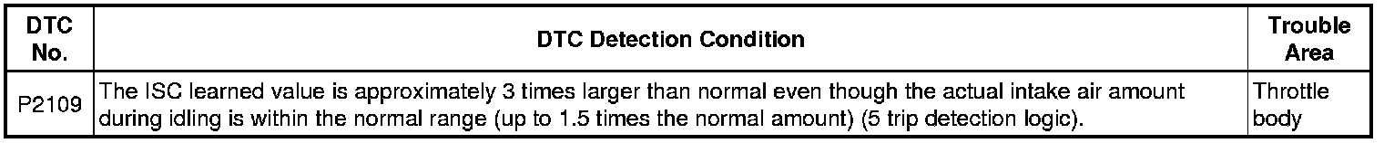 If there are deposits in the throttle valve, a decrease in the ISC flow rate may cause engine stall an unstable idling. Therefore, the necessary ISC flow rate for idling is maintained using the ISC learned value and feedback. The ECM stores this DTC if the ISC learned value approaches its limit. The ECM begins monitoring for the DTC detection conditions when the following preconditions are met: