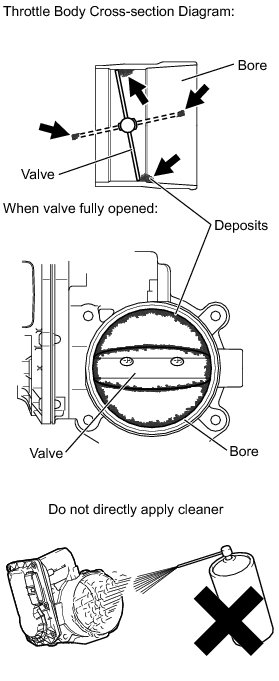 * Do not directly apply non-residue solvent to the throttle body or wash the throttle body. Cleaning solvent may leak into the motor from the shaft and cause problems such as rust or valve movement problems.