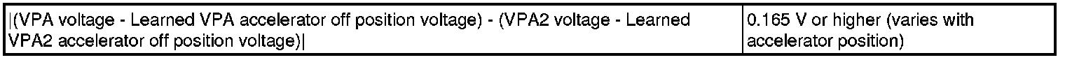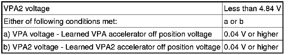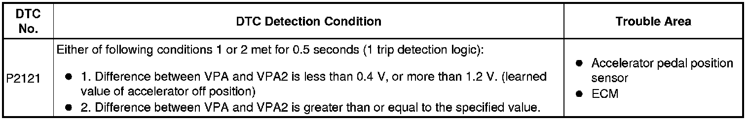 The accelerator pedal position sensor is mounted on the accelerator pedal bracket. The accelerator pedal position sensor has 2 sensor elements and 2 signal outputs: VPA and VPA2. VPA is used to detect the actual accelerator pedal angle (used for engine control) and VPA2 is used to detect malfunctions in VPA. When the difference between the output voltages of VPA and VPA2 deviates from the standard, the ECM determines that the accelerator pedal position sensor is malfunctioning. The ECM turns on the MIL and the DTC is set.
