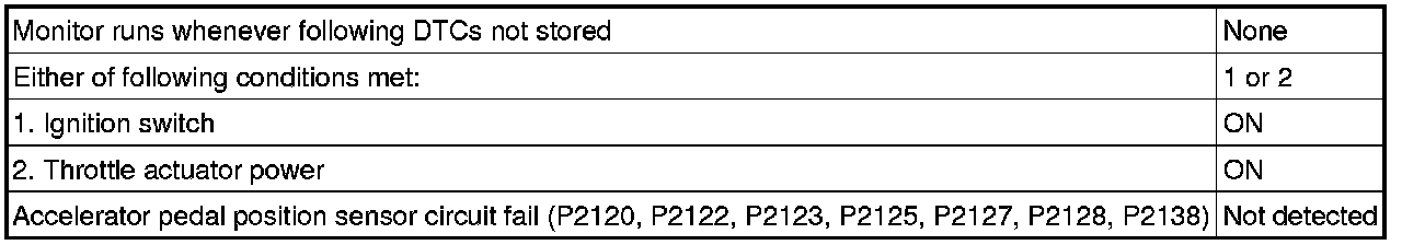 The accelerator pedal position sensor has two (main and sub) sensor circuits. If a malfunction occurs in either of the sensor circuits, the ECM detects the abnormal signal voltage difference between the two sensor circuits and switches to limp mode. In limp mode, the functioning circuit is used to calculate the accelerator pedal opening angle to allow the vehicle to continue driving. If both circuits malfunction, the ECM regards the opening angle of the accelerator pedal as being fully closed. In this case, the throttle valve remains closed as if the engine is idling.