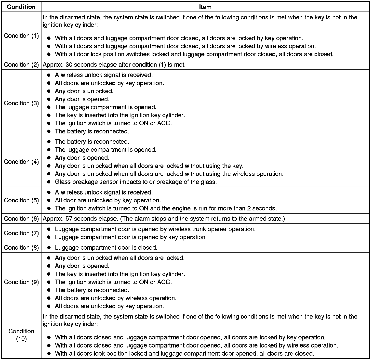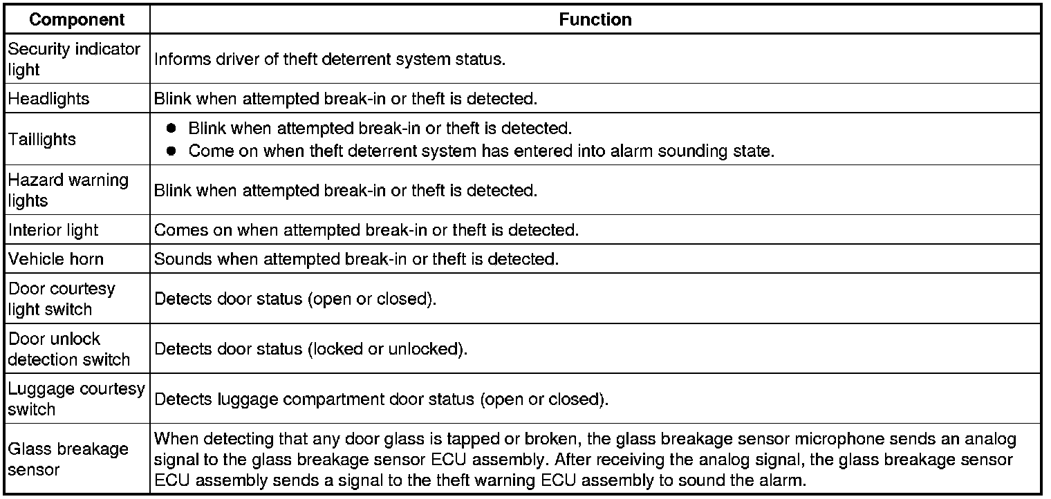 * The alarm function will be activated when someone attempts to forcibly unlock the any of the doors, open any of the doors or the luggage compartment door while the system is in the armed state.
