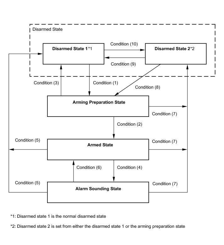 * The alarm is initially set (when shipped from the factory) to active arming mode (not passive arming mode).