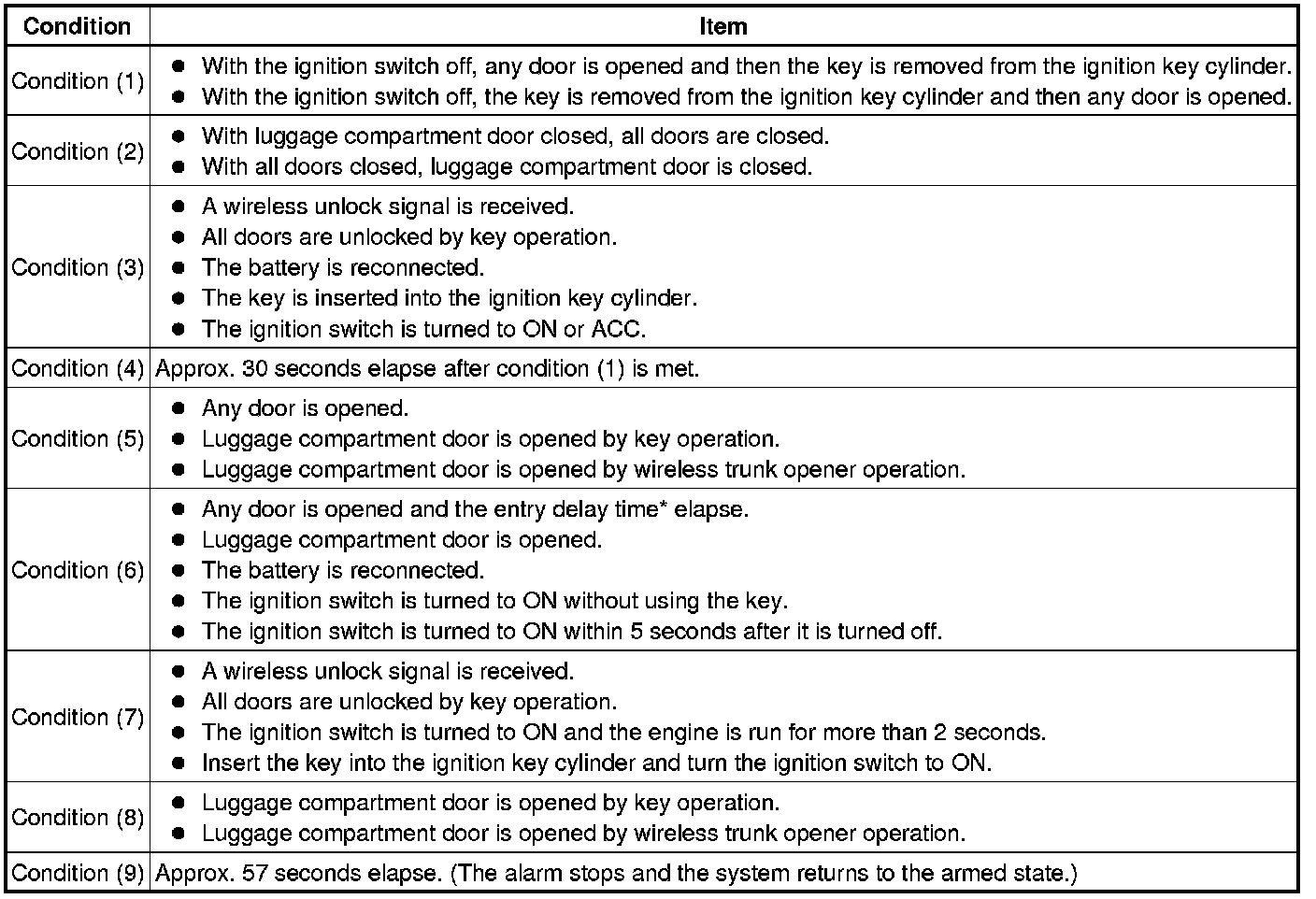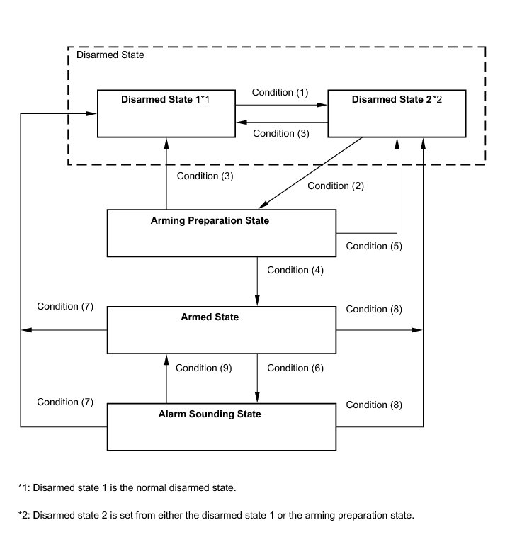 * *: When any door is opened while all the doors are closed during passive arming mode, the entry delay time starts. If the switch condition (armed state -> disarmed state (1) or (2)) is met during the entry delay time, the theft deterrent system will return to disarmed state (1) or (2). However, if the switch condition for disarmed state (1) or (2) is not met, the theft deterrent system will recognize it as a theft and set off the alarm. Entry delay time of 0, 14 or 30 sec. can be selected by the customizing function.