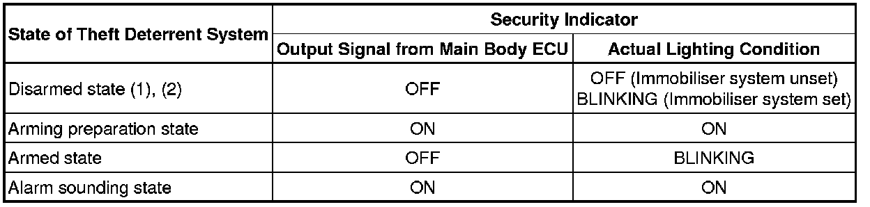 (a) The main body ECU outputs a signal to come on the security indicator light assembly, according to the state of the theft deterrent system. However, some of the actual lighting conditions of the security indicator light assembly are different from the output signals of the main body ECU.