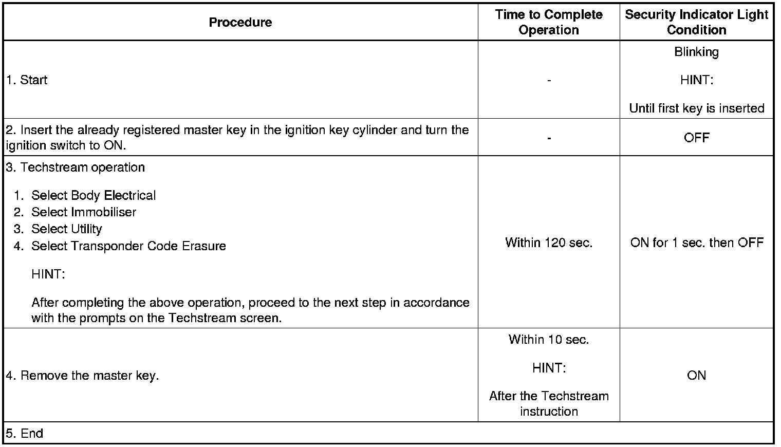 (b) Finish the automatic key code registration mode. The automatic key code registration mode can be forced to end when at least 1 key code (immobiliser code) for the master key has been registered.