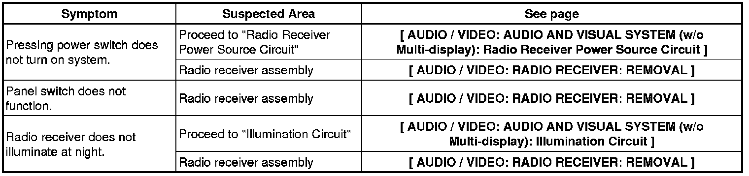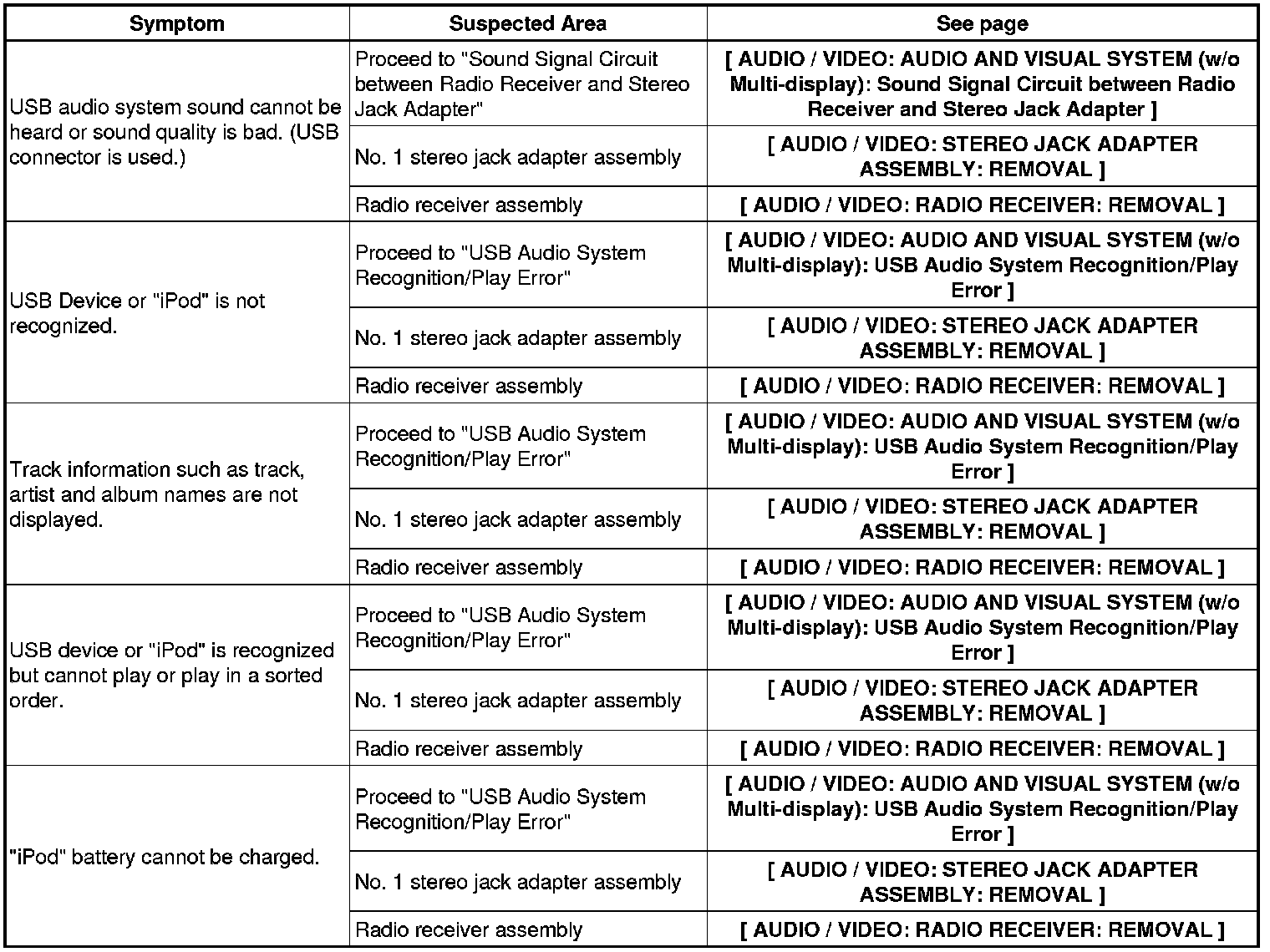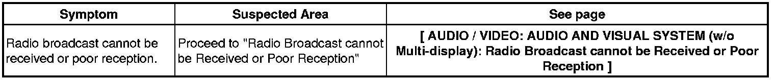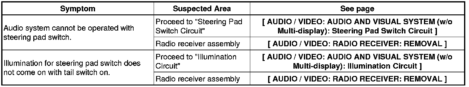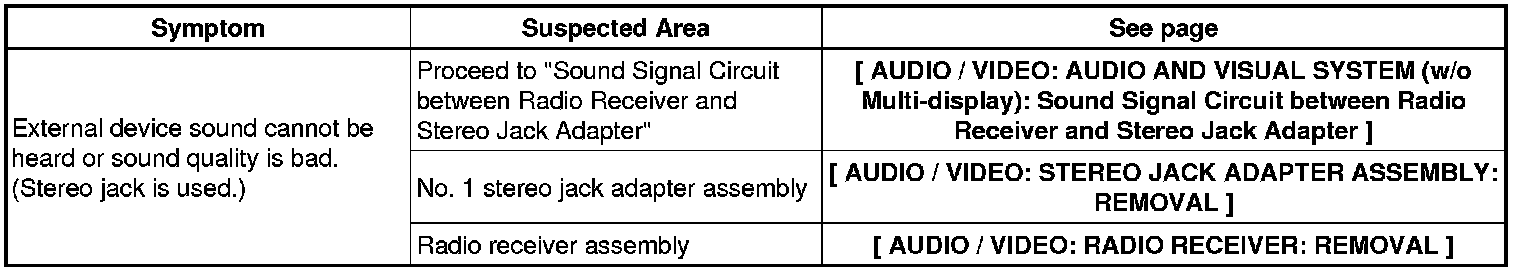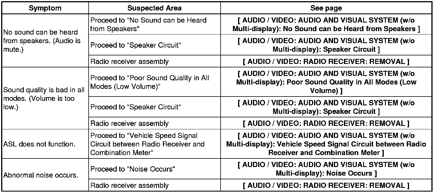 AUDIO / VIDEO: AUDIO AND VISUAL SYSTEM (w/o Multi-display): PROBLEM SYMPTOMS TABLE