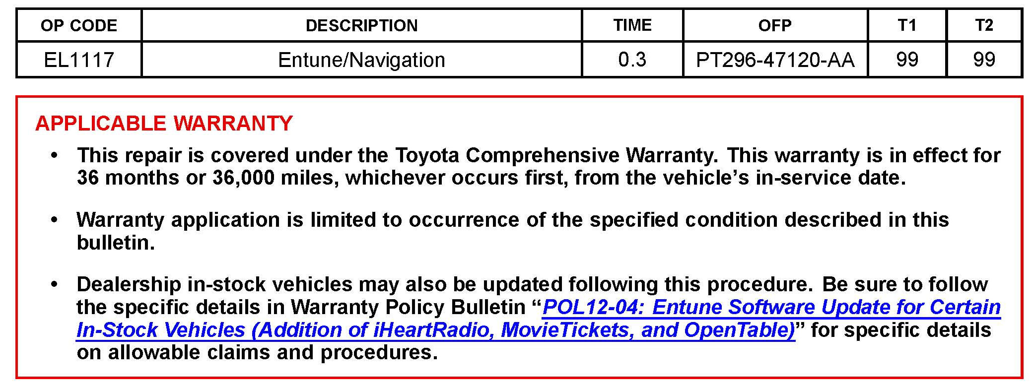 Three NEW applications (iHeartRadio, MovieTickets, and OpenTable(R)) have been developed to enhance the Entune experience in vehicles equipped with the Display Audio Navigation System with Entune. All customers with these vehicles have been shipped instructions on this update along with a USB drive to install the new applications. In the event that a customer requests the install be performed by a technician, follow the procedures in this bulletin to perform the update.