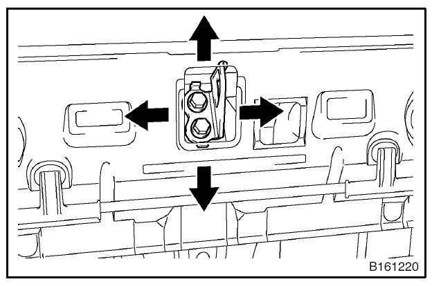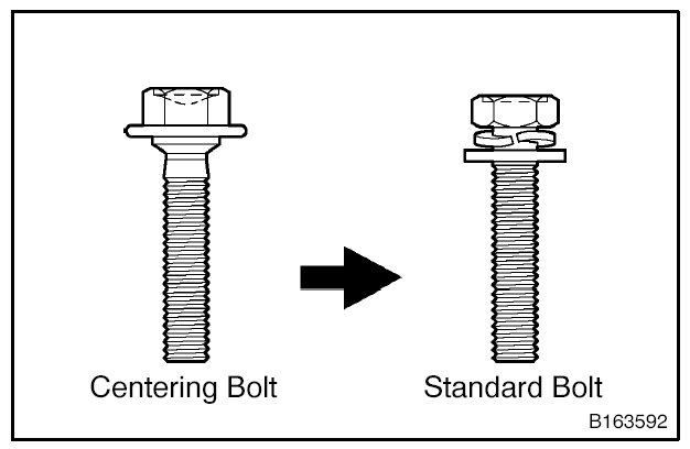 HINT: Centering bolts are used to mount the hood hinge and hood lock. The hood and hood lock cannot be adjusted with the centering bolts installed. Substitute the centering bolts with standard bolts (with washers) when making adjustments.