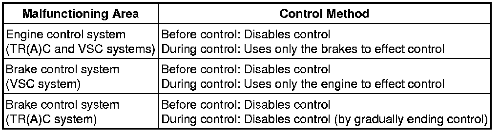 * If a VSC system component malfunctions before VSC control begins, VSC control will be prohibited. If a system component malfunctions during VSC control, the system will gradually stop performing the control so as not to trigger a sudden change in vehicle operation.