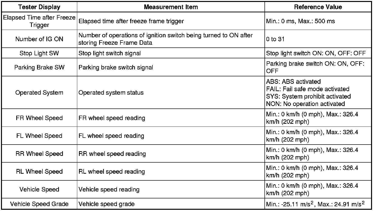 * Freeze Frame Data at the time the ABS operates:
