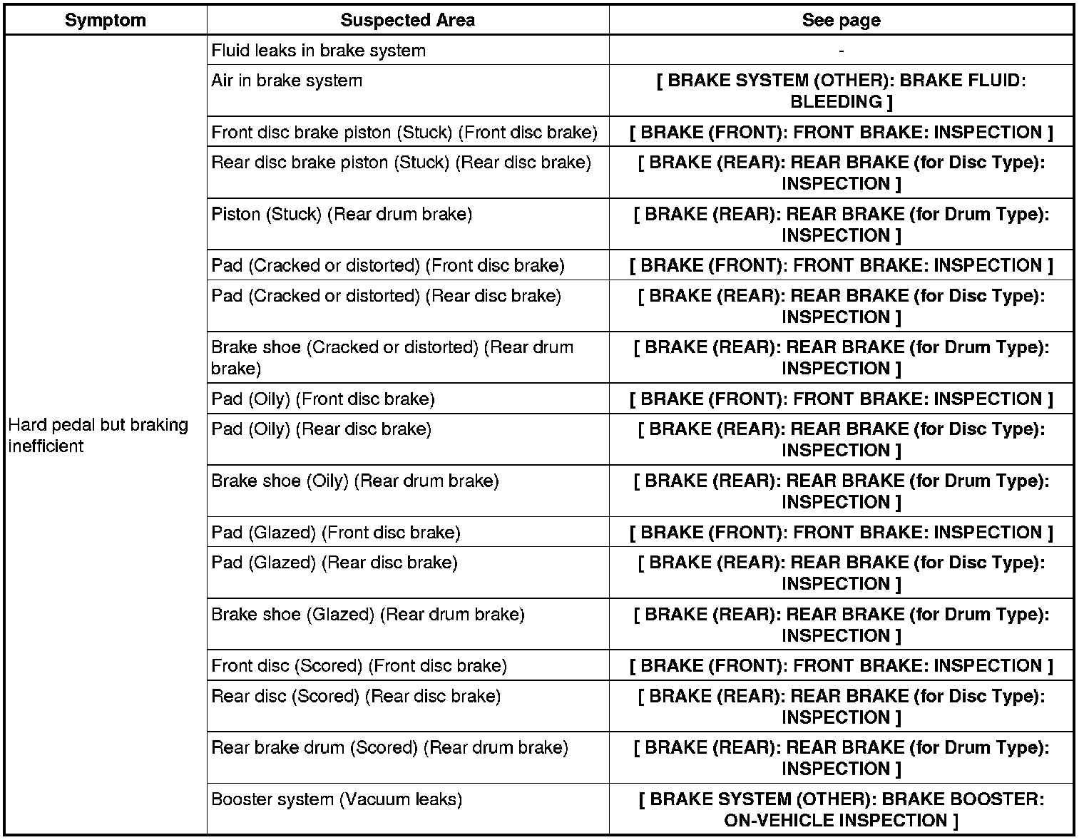 BRAKE SYSTEM (OTHER): BRAKE SYSTEM: PROBLEM SYMPTOMS TABLE