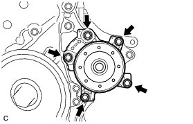 (a) Remove the 5 bolts and water pump assembly from the timing chain cover.
