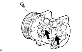 (a) When replacing the compressor assembly with pulley with a new one, gradually discharge the inert gas (helium) from the service valve, and drain the following amount of oil from the vents indicated by the arrows in the illustration before installation.