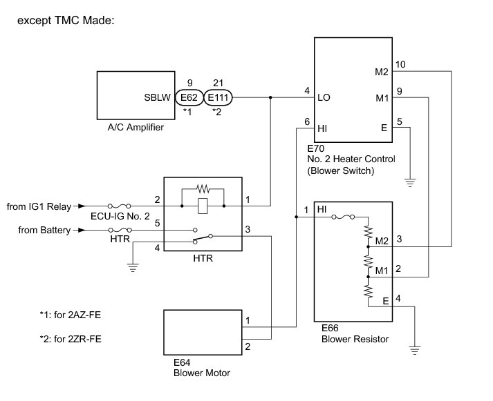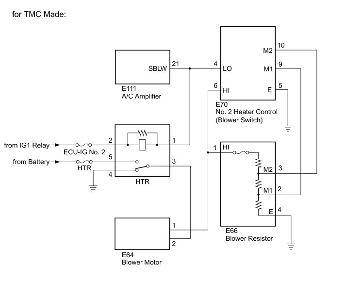 When the No. 2 heater control (blower switch) is operated, the HTR relay will turn on and send current to operate the blower motor. Operating the No. 2 heater control (blower switch) adjusts the flow of current between the blower resistor and body ground, thus, adjusting the speed of the blower motor.
