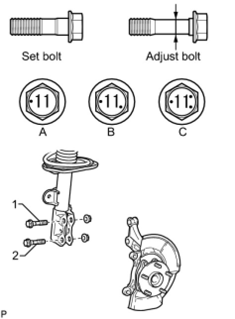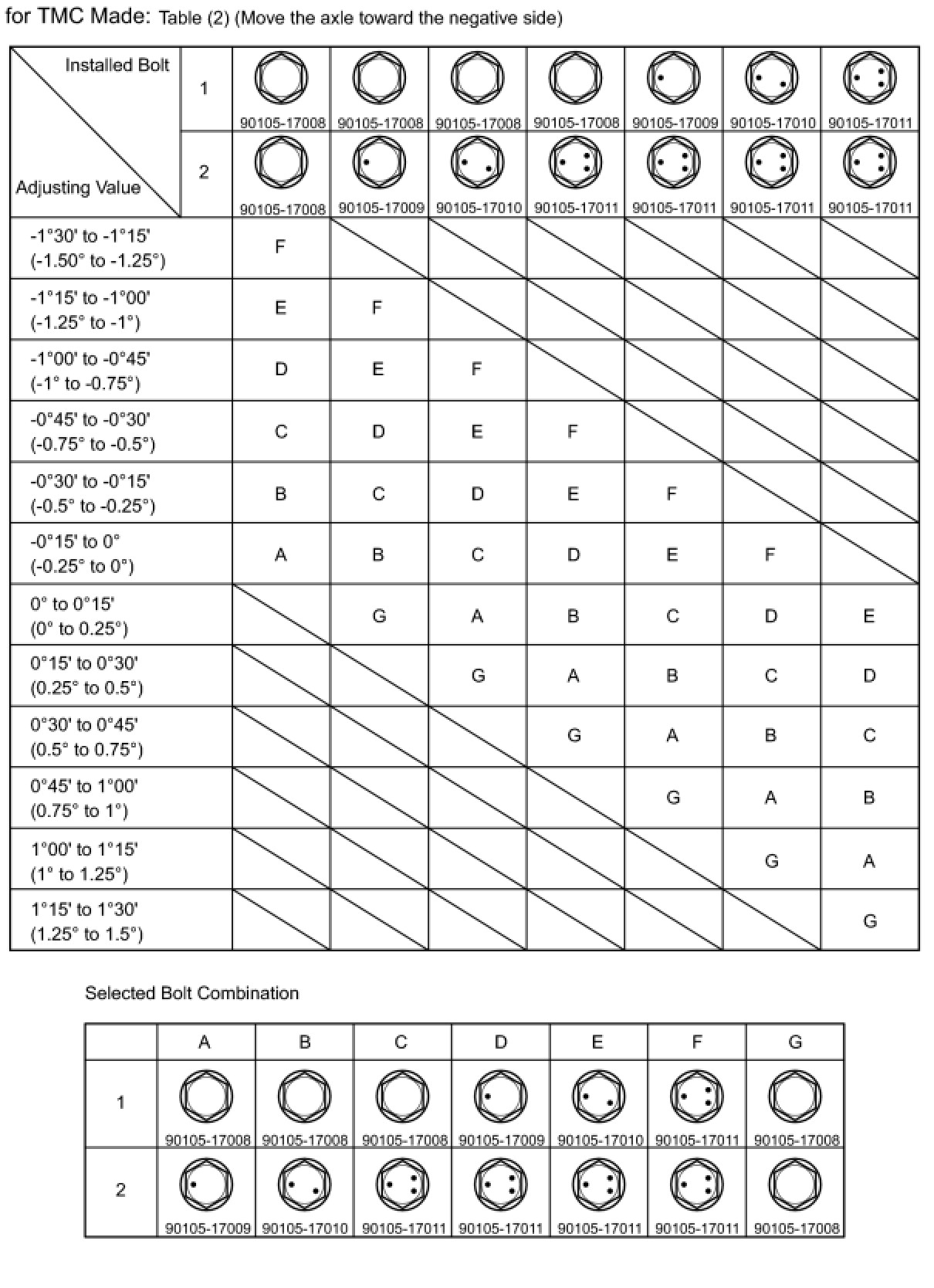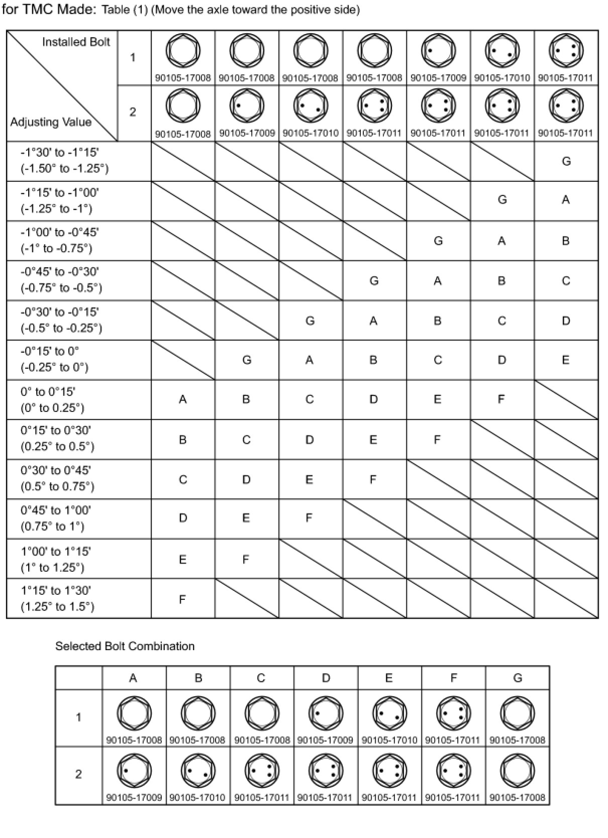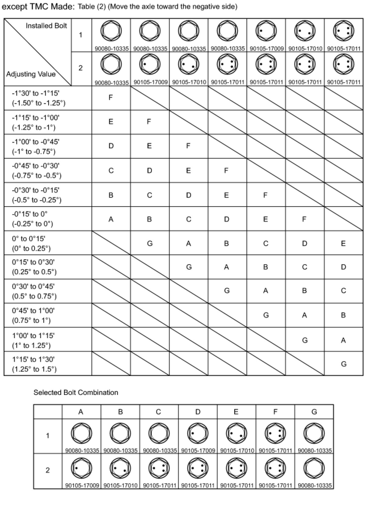 Check the combination of installed bolts. Select appropriate bolts from the table below to adjust the camber to the specified values.