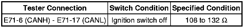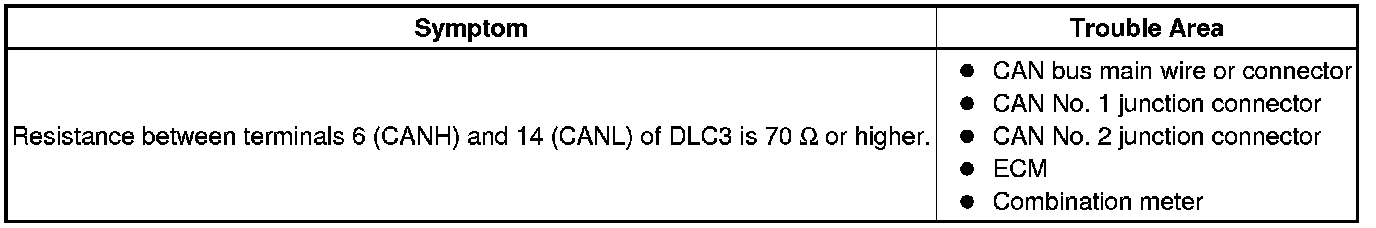 There may be an open circuit in the CAN main wire and/or the DLC3 branch wire when the resistance between terminals 6 (CANH) and 14 (CANL) of the DLC3 is 70 Ohms or higher.