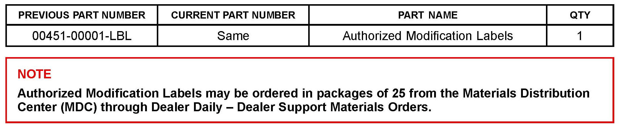 A. Using a permanent marker or ball point pen complete the Authorized Modifications Label and attach to the vehicle. The Authorized Modifications Label is available through the MDC P/N 00451-00001-LBL.