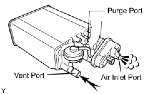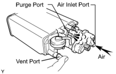 (1) With the purge port and air inlet port closed, apply 19.6 kPa (0.2 kgf/cm2, 2.81 psi) of pressurized air into the vent port, then confirm that pressure is retained for 1 minute.
