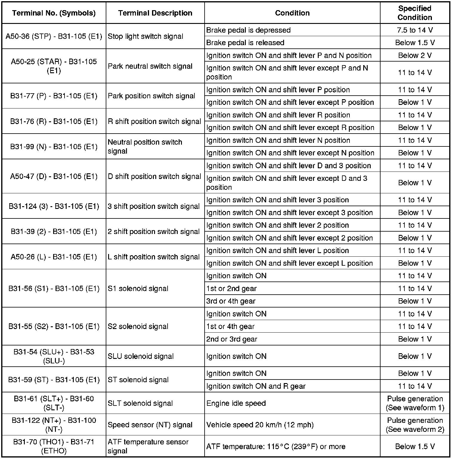 In the table, first follow the information under "Condition". Look under "Terminal No. (Symbols)" for the terminals to inspected. The standard voltage between the terminals is shown under "Specific Condition".
