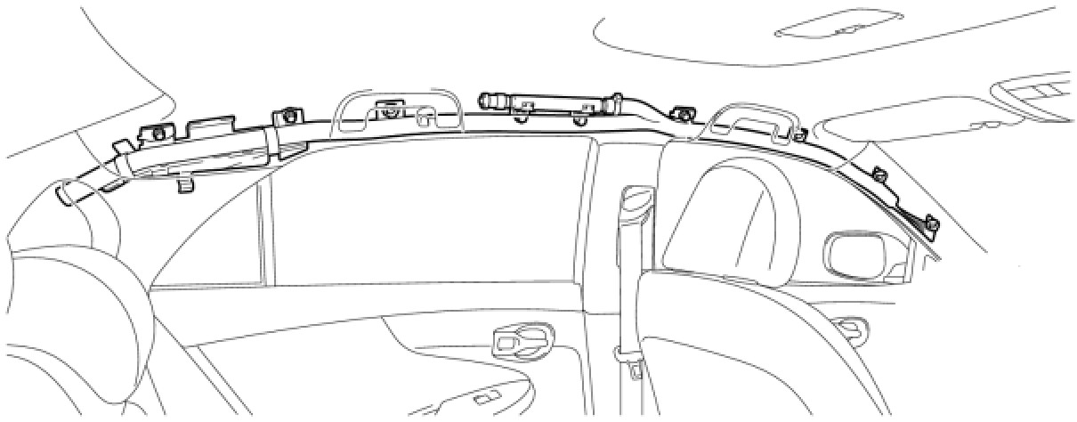 * Cuts, minute cracks or marked discoloration on the front pillar garnish or roof headlining assembly around the curtain shield airbag assembly.