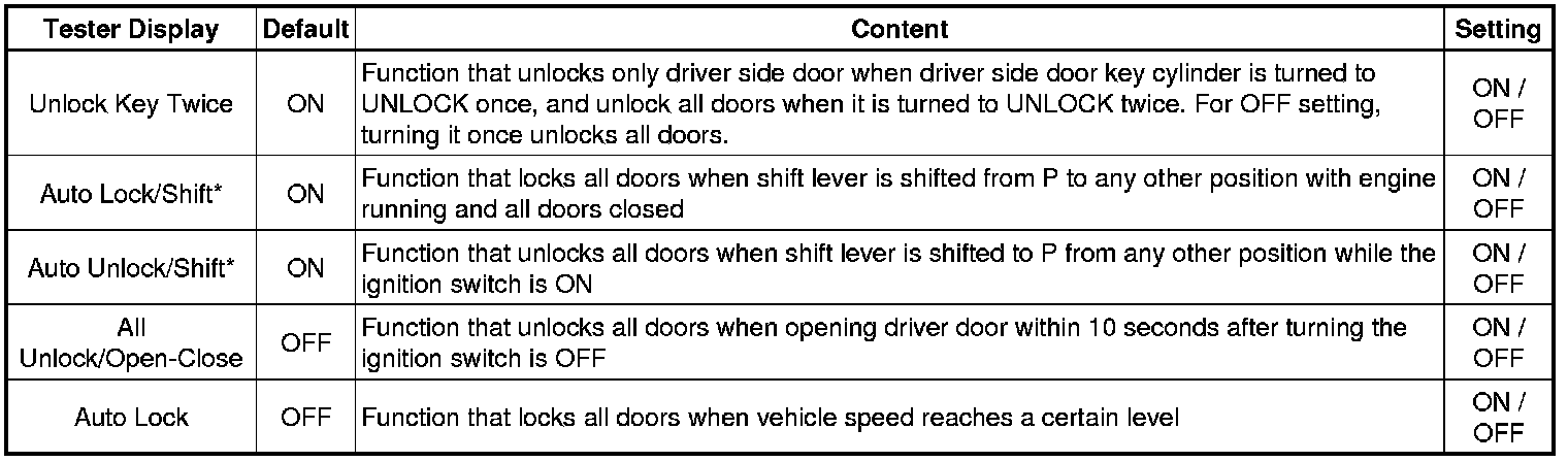 * Driver door unlock default setting: