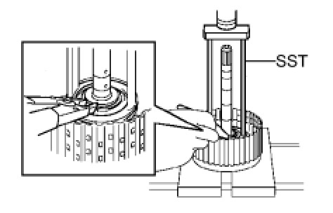 (a) Using SST, a press and a screwdriver, remove the snap ring.