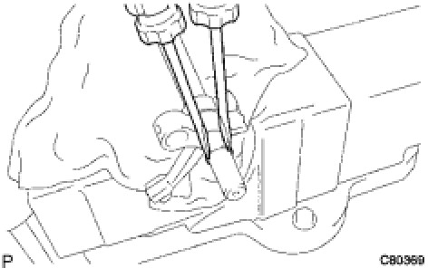 (a) Using 2 screwdrivers and a hammer, tap out the snap ring from the No. 2 gear shift fork shaft.