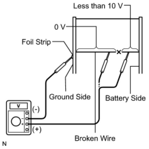 If the defogger wire is not broken, the voltmeter should indicate 0 V at the positive (+) end of the defogger wire but gradually increase to approximately 12 V as the meter probe moves to the other end.