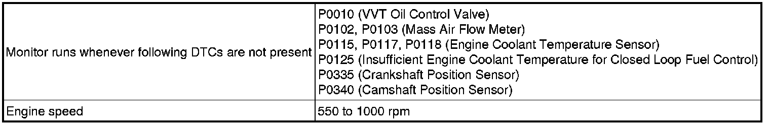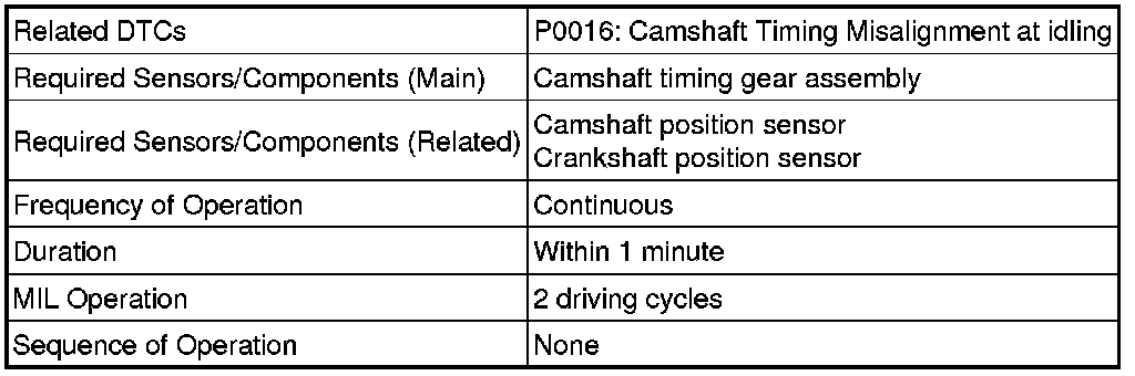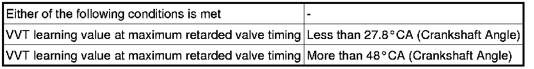 To monitor the correlation of the intake camshaft position and crankshaft position, the ECM checks the VVT learning value while the engine is idling. The VVT learning value is calibrated based on the camshaft position and crankshaft position. The intake valve timing is set to the most retarded angle while the engine is idling. If the VVT learning value is out of the specified range in consecutive driving cycles, the ECM illuminates the MIL and stores the DTC.