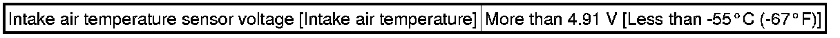 If the sensor output voltage is more than 4.91 V for 0.5 seconds or more, the ECM determines that there is an open in the intake air temperature sensor circuit, and sets DTC P0113. Conversely, if the output voltage is less than 0.18 V for 0.5 seconds or more, the ECM determines that there is a short in the sensor circuit, and stores DTC P0112.