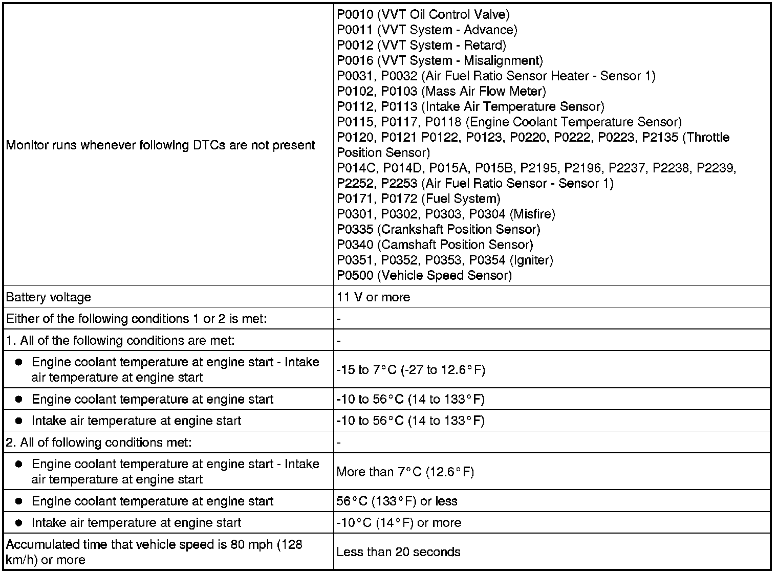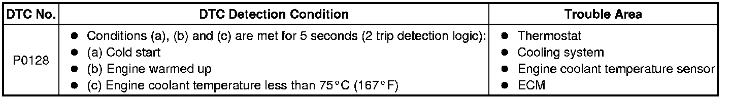 This DTC is set when the engine coolant temperature does not reach 75°C (167°F) despite sufficient engine warm-up time having elapsed.