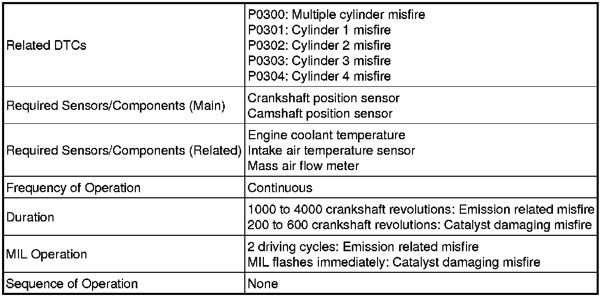When the engine misfires, high concentrations of hydrocarbons (HC) enter the exhaust gas. Extremely high hydrocarbon concentration levels can cause an increase in exhaust emission levels. Extremely high concentrations of hydrocarbons can also cause increases in the three-way catalytic converter temperature, which may cause damage to the three-way catalytic converter. To prevent this increase in emissions and to limit the possibility of thermal damage, the ECM monitors the misfire count. When the temperature of the three-way catalytic converter reaches the point of thermal degradation, the ECM blinks the MIL. To monitor misfires, the ECM uses both the camshaft position sensor and the crankshaft position sensor. The camshaft position sensor is used to identify any misfiring cylinders and the crankshaft position sensor is used to measure variations in the crankshaft rotation speed. Misfires are counted when the crankshaft rotation speed variations exceed predetermined thresholds. If the misfire count exceeds the threshold levels, and could cause emission control system performance deterioration, the ECM illuminates the MIL and stores a DTC.