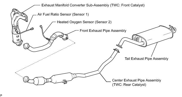 Replace the exhaust manifold converter sub-assembly and the center exhaust pipe assembly together when catalyst replacement is necessary. (Excluding air fuel ratio sensor and heated oxygen sensor)