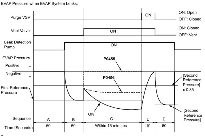 In operation C, the leak detection pump creates negative pressure (vacuum) in the EVAP system and the EVAP system pressure is measured. If the stabilized system pressure is higher than [second reference pressure x 0.35] (near atmospheric pressure), the ECM determines that the EVAP system has a large leak, illuminates the MIL and stores the DTC (2 trip detection logic).