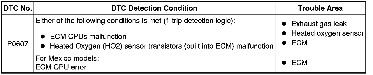 * If DTC P0607 and P0136, P0137 or P0138 are output, the output voltage of the heated oxygen sensor may remain close to 0 V or become high (around 1 V or more).