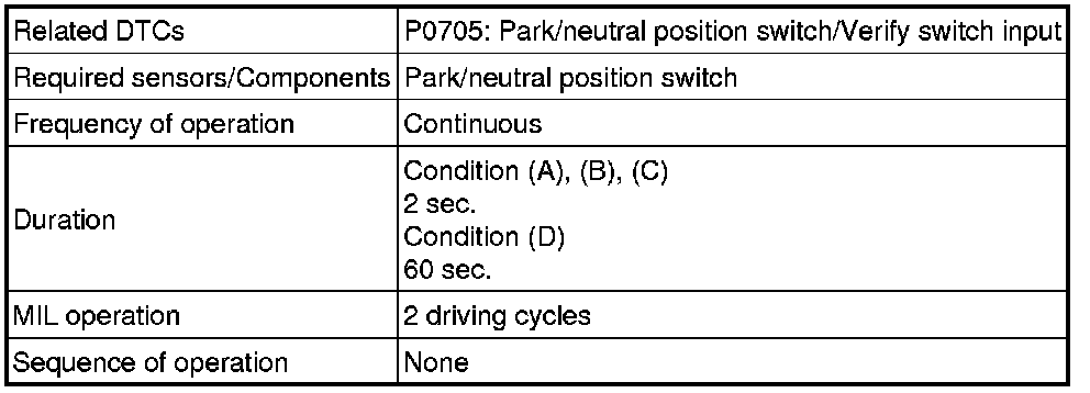 The park/neutral position switch sends a signal to the ECM according to the shift position (P, R, N, or D). The ECM determines that there is a problem with the switch or related parts if it receives more than 1 position signal simultaneously. The ECM will turn on the MIL and store the DTC.