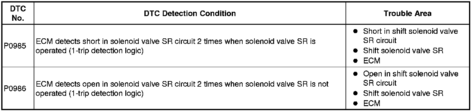 U250E AUTOMATIC TRANSMISSION / TRANSAXLE: AUTOMATIC TRANSAXLE SYSTEM: P0985, P0986: Shift Solenoid "E" Control Circuit Low (Shift Solenoid Valve SR)