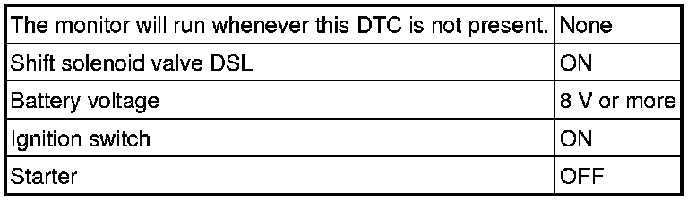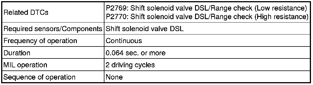 Torque converter lock-up is controlled by the ECM based on engine rpm, engine load, engine temperature, vehicle speed, transmission temperature, and shift range selection. The ECM determines the lock-up status of the torque converter by comparing the engine rpm (NE) to the input turbine rpm (NT). The ECM calculates the actual transmission gear by comparing input turbine rpm (NT) to counter gear rpm (NC). When conditions are appropriate, the ECM requests "lock-up" by applying control voltage to the shift solenoid DSL. When the DSL is opened, it applies pressure to the lock-up relay valve and locks the torque converter assembly. If the ECM detects an open or short in the DSL solenoid circuit, the ECM interprets this as a fault in the DSL solenoid or circuit. The ECM will turn on the MIL and store the DTC.