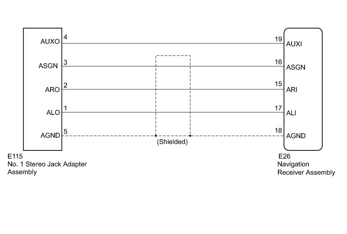 The No. 1 stereo jack adapter assembly sends the sound signal from an external device to the navigation receiver assembly through this circuit.