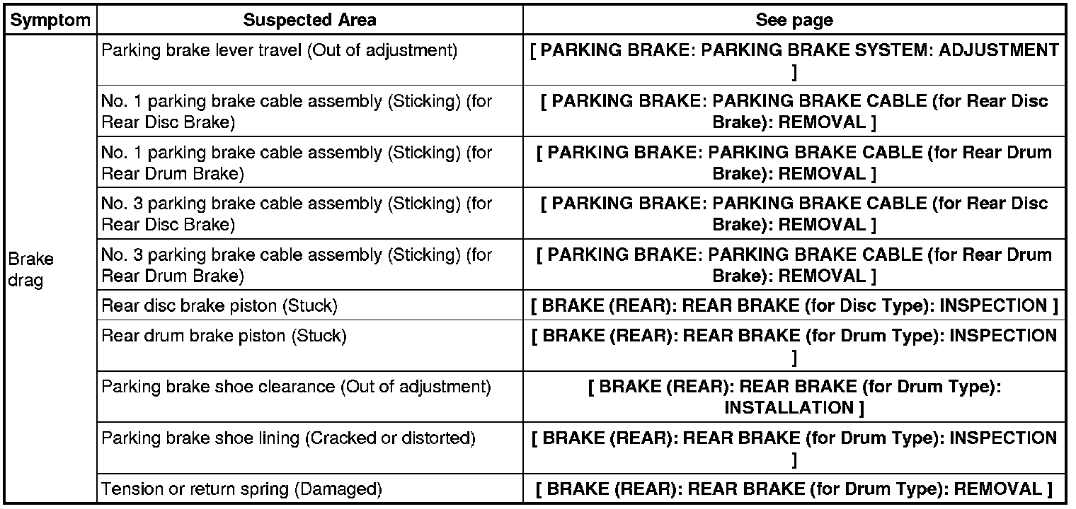 PARKING BRAKE: PARKING BRAKE SYSTEM: PROBLEM SYMPTOMS TABLE