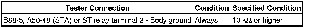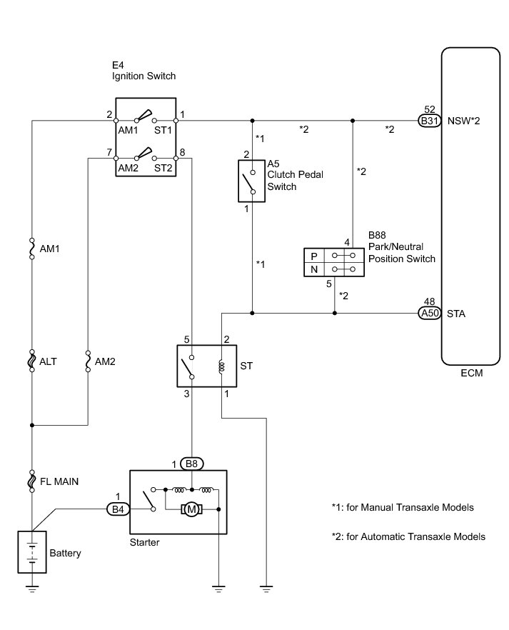 While the engine is being cranked, current flows from terminal ST1 of the ignition switch to the park/neutral position switch assembly (automatic transaxle models) or clutch pedal switch assembly (manual transaxle models) and also flows to terminal STA of the ECM (STA Signal).