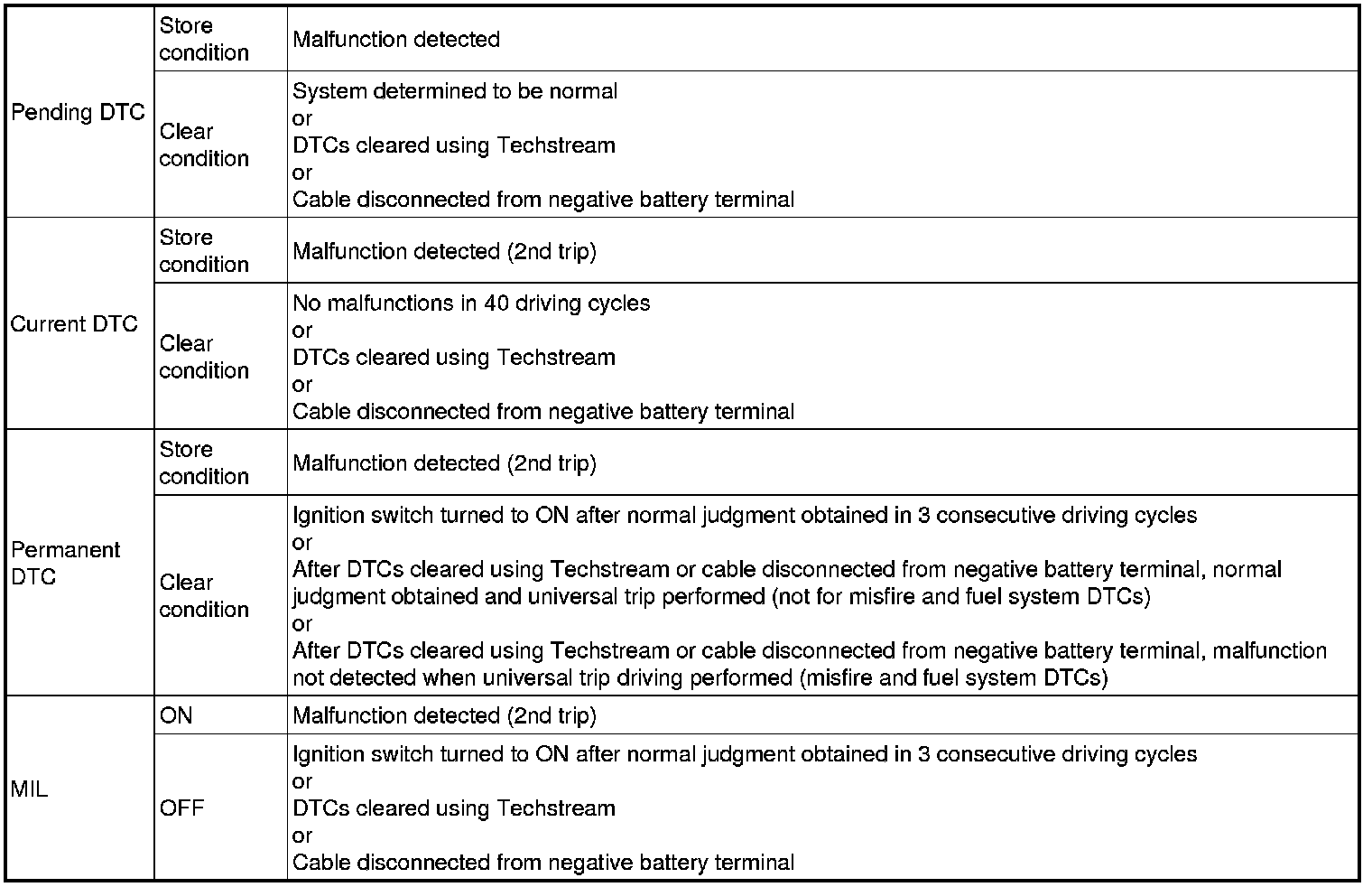 * Current and pending DTCs can be cleared by using the Techstream or by disconnecting the cable from the negative battery terminal. However, permanent DTCs cannot be cleared using either of these two methods.