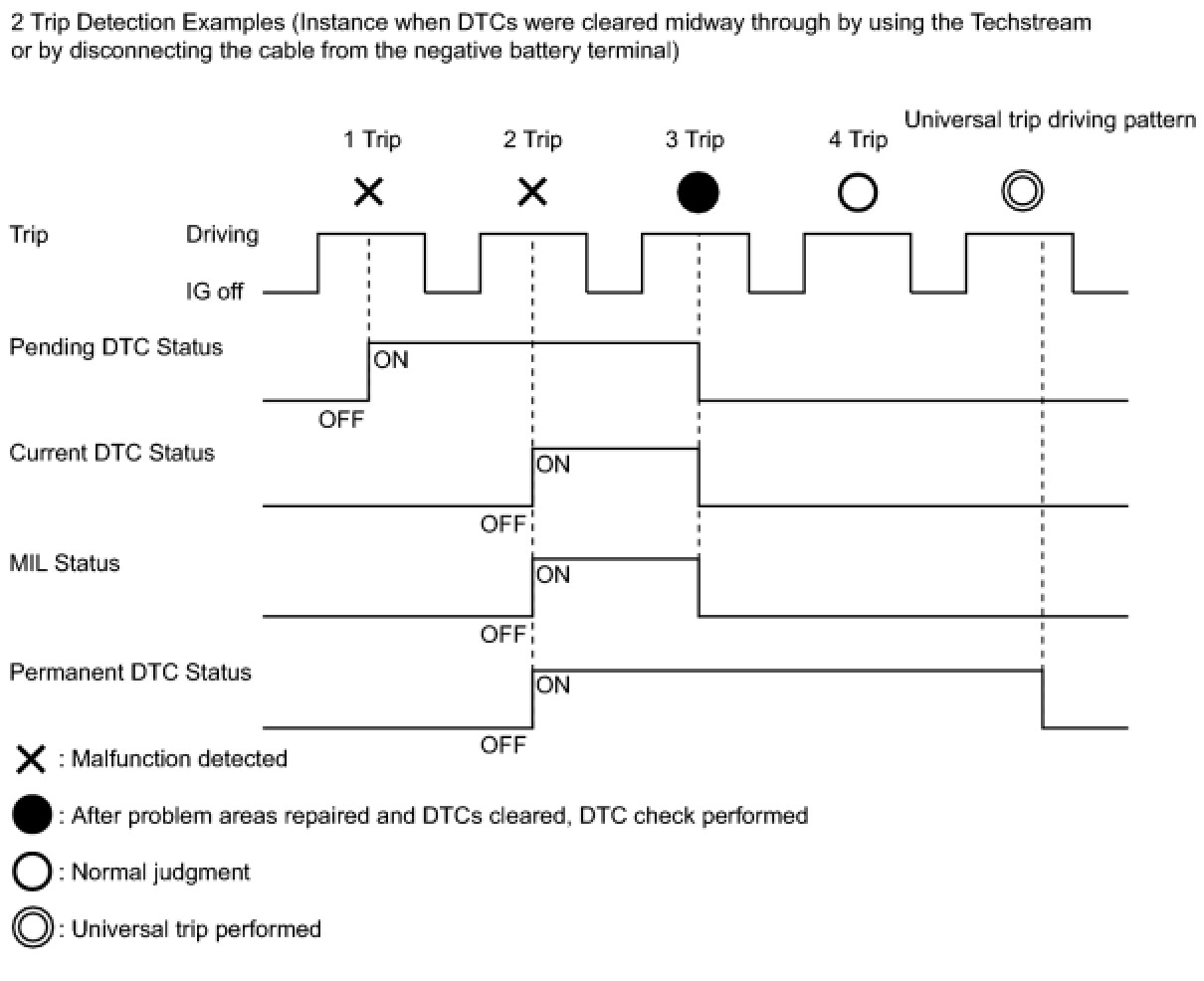 * After clearing current DTCs using the Techstream (or by disconnecting the cable from the negative battery terminal), permanent DTCs can be cleared when the system is determined to be normal for the relevant DTCs and then the universal trip is performed. The driving pattern to obtain a normal judgment is described under the "CONFIRMATION DRIVING PATTERN" for the respective DTC.