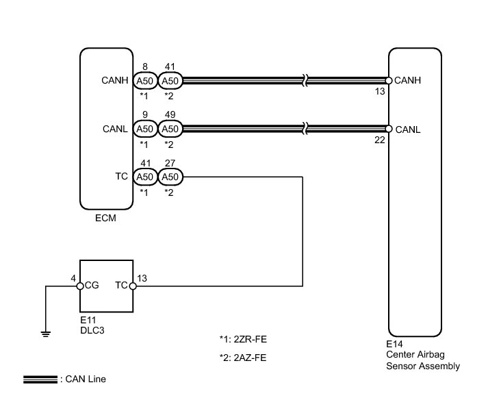 * A DTC output mode signal is transmitted through the CAN communication system to each ECU including the center airbag sensor assembly. Thus when all systems do not enter DTC output mode, there may be an ECM malfunction.