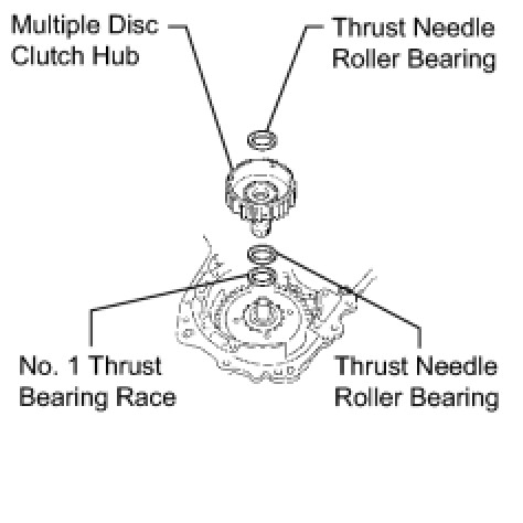 (a) Remove the thrust needle roller bearing, multiple disc clutch hub, thrust needle roller bearing and No. 1 thrust bearing race from the transaxle case.