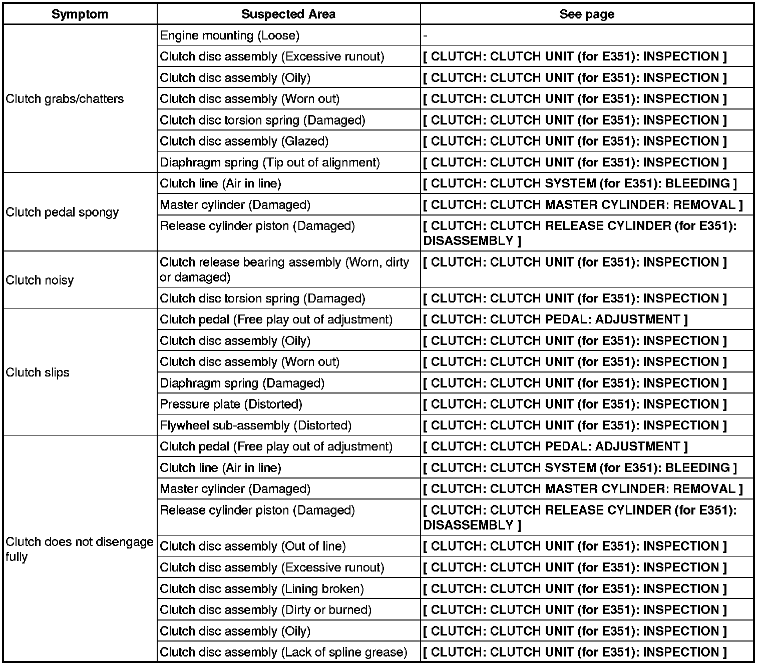 CLUTCH: CLUTCH SYSTEM (for E351): PROBLEM SYMPTOMS TABLE