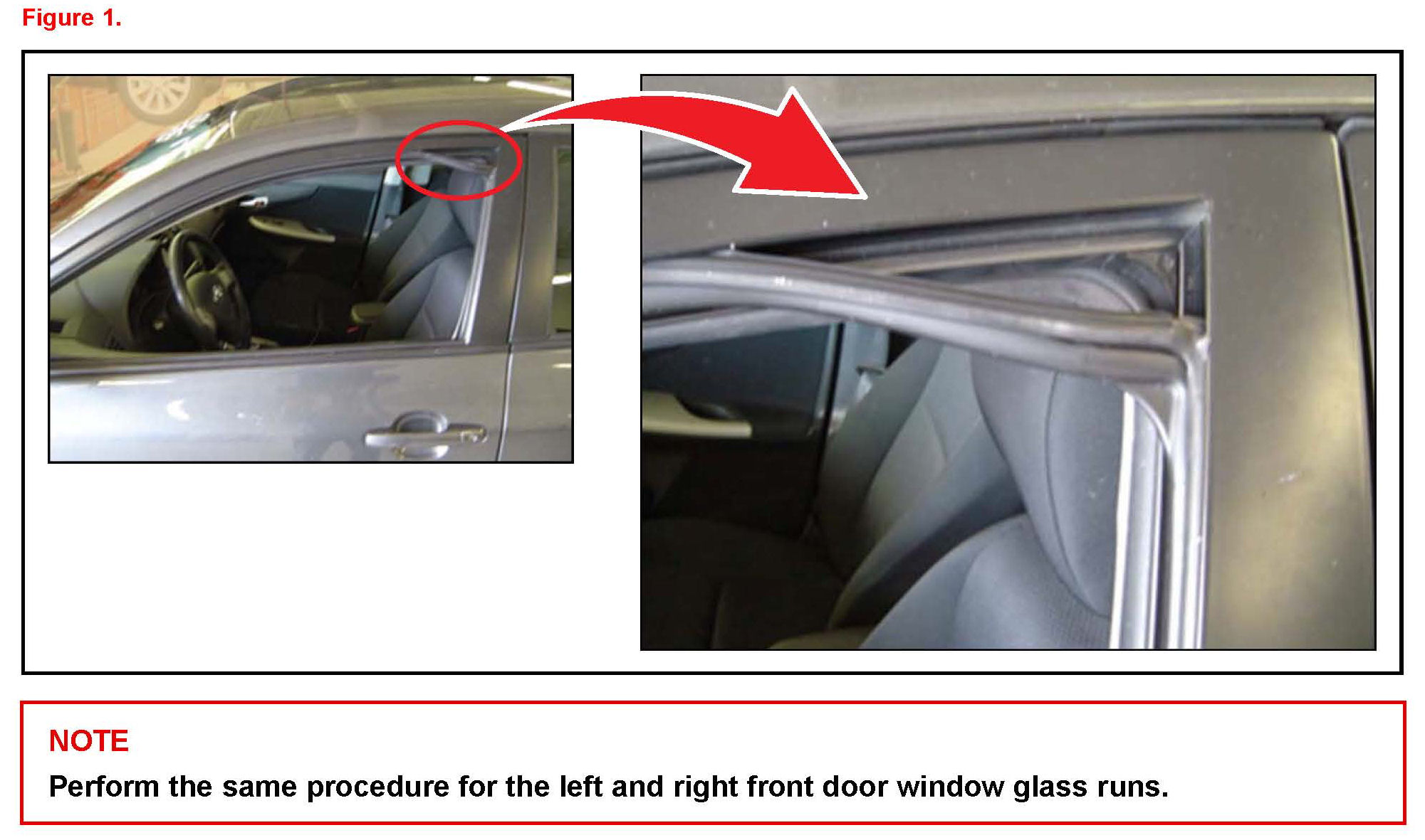 Some 2009 - 2012 model year Corolla vehicles may exhibit a condition where the front door glass window run is pulled out of the door frame during operation of the window. This may also result in the window binding and becoming inoperable. Replace the door glass run following the procedures in this bulletin to address this condition.
