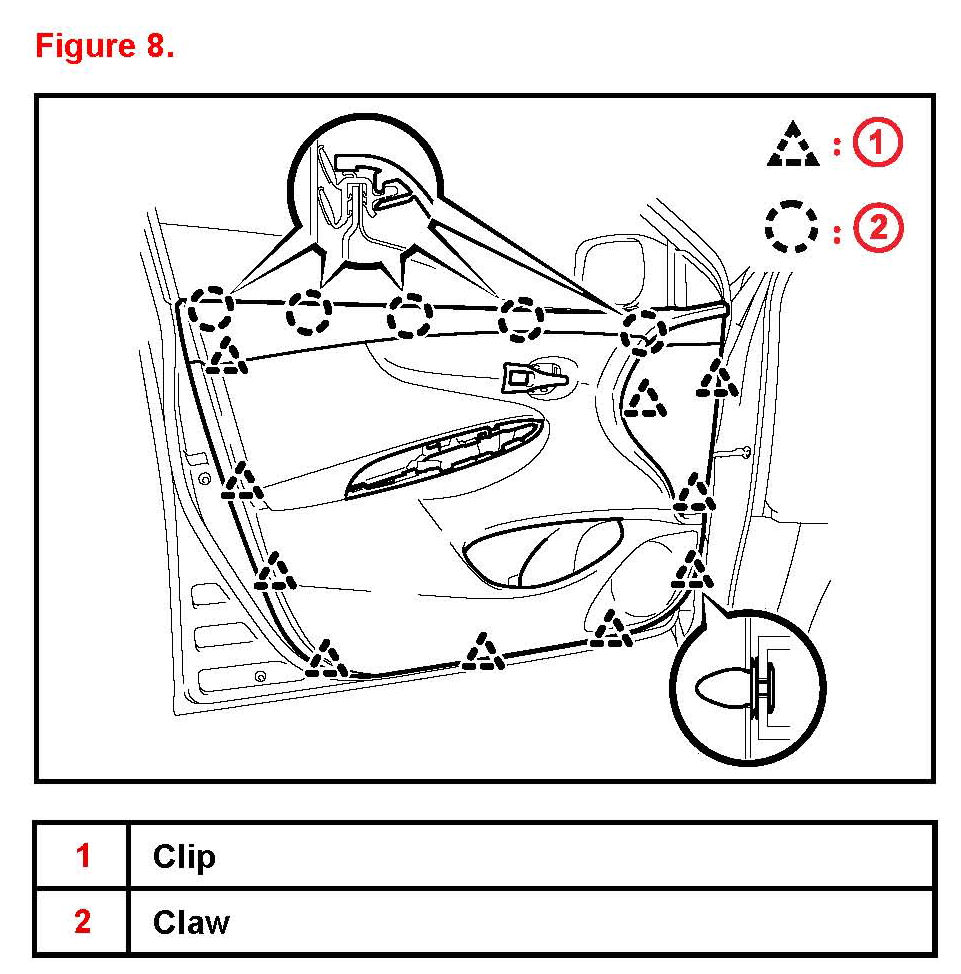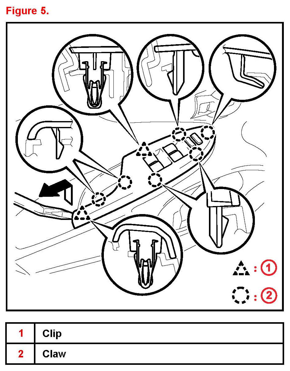 D. Disengage the 5 claws and separate the front door trim board sub-assembly from the front door inner glass weatherstrip. See Figure 8.